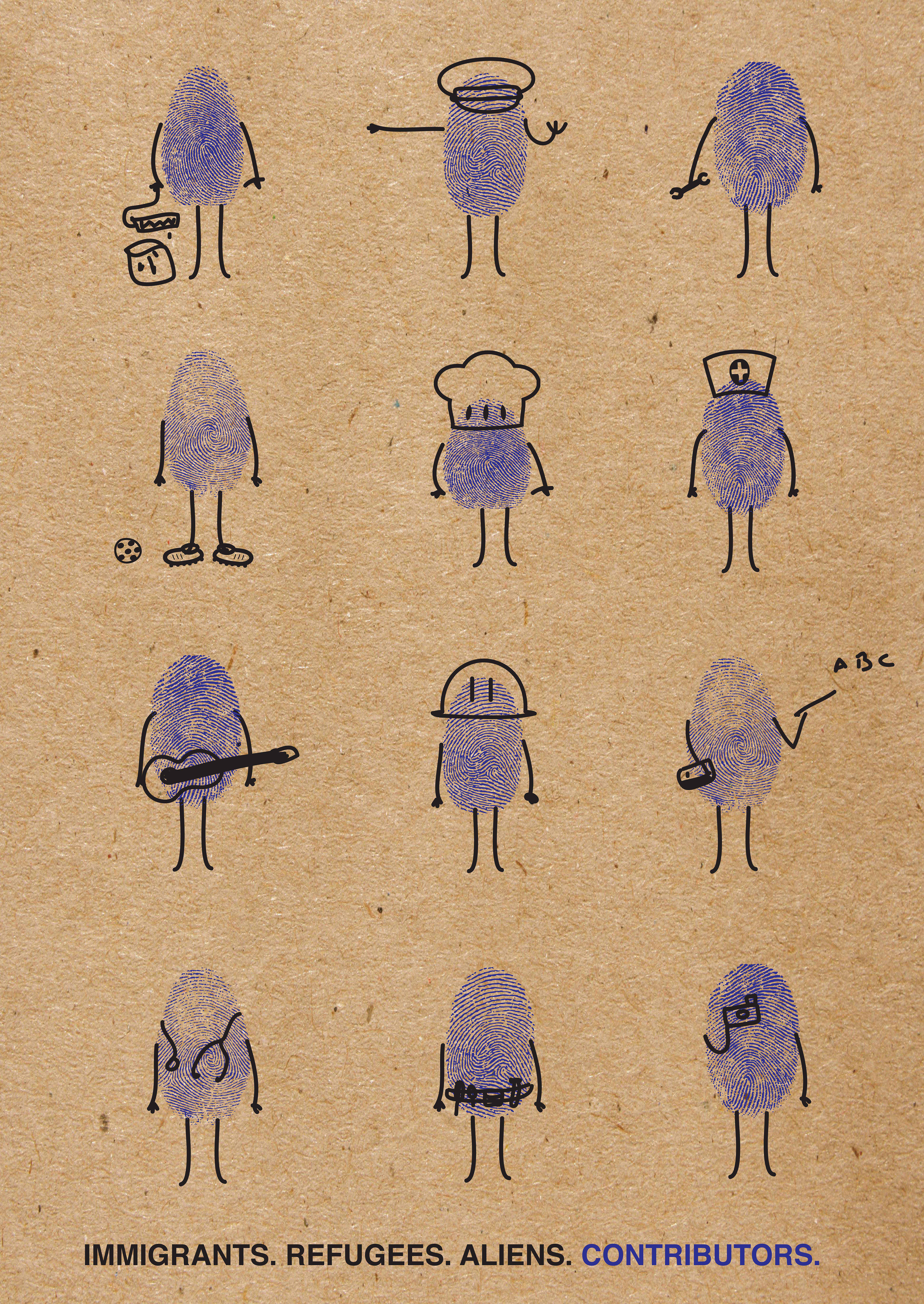 Approach: Migrants enter Europe as fingerprints in a database. Through their work and contributions, they carve out individual identities within their communities. The visual shows this transformation—from bureaucratic data points to valued professionals shaping European society.